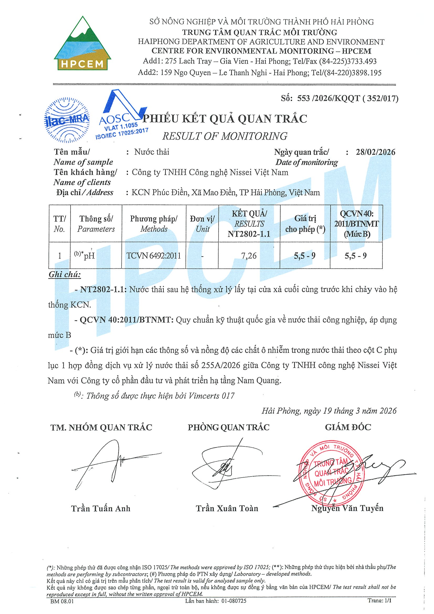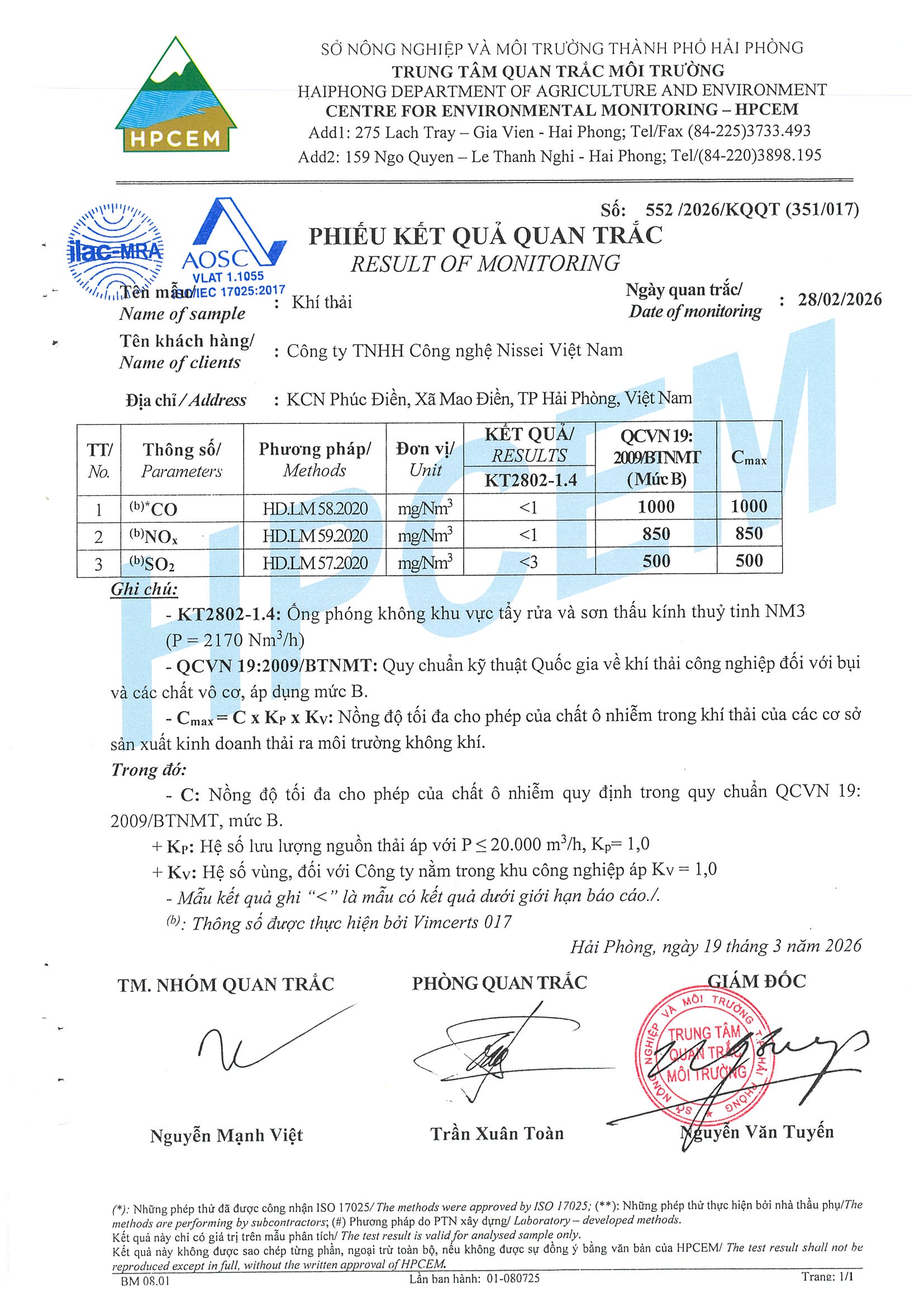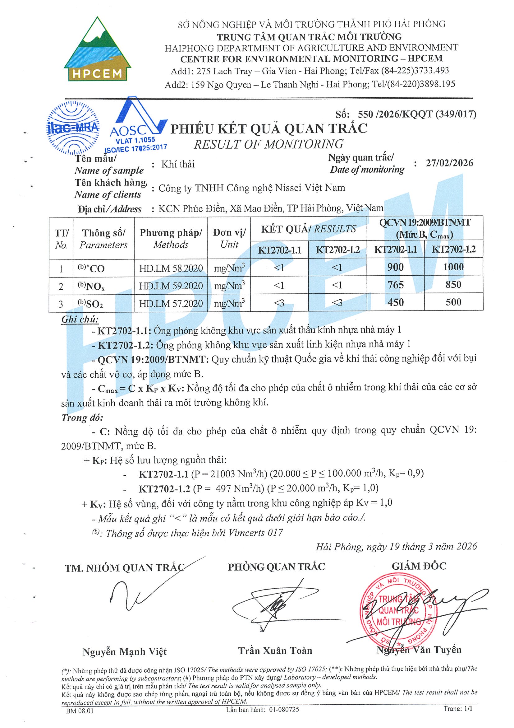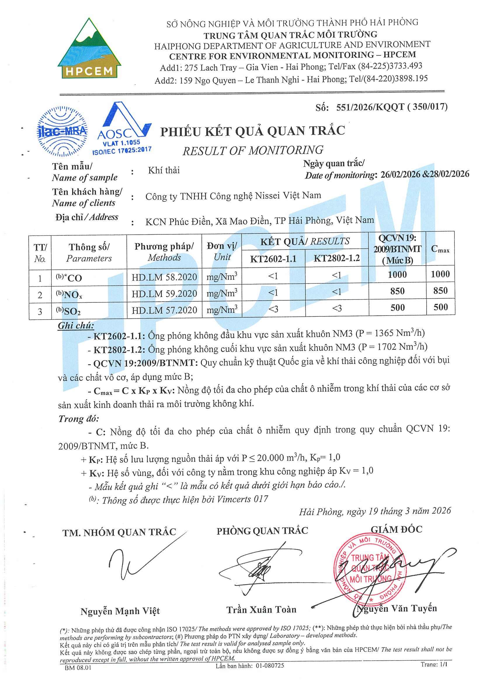 Kết quả quan trắc môi trường Công ty TNHH Công nghệ Nissei Việt Nam quý I, 2026