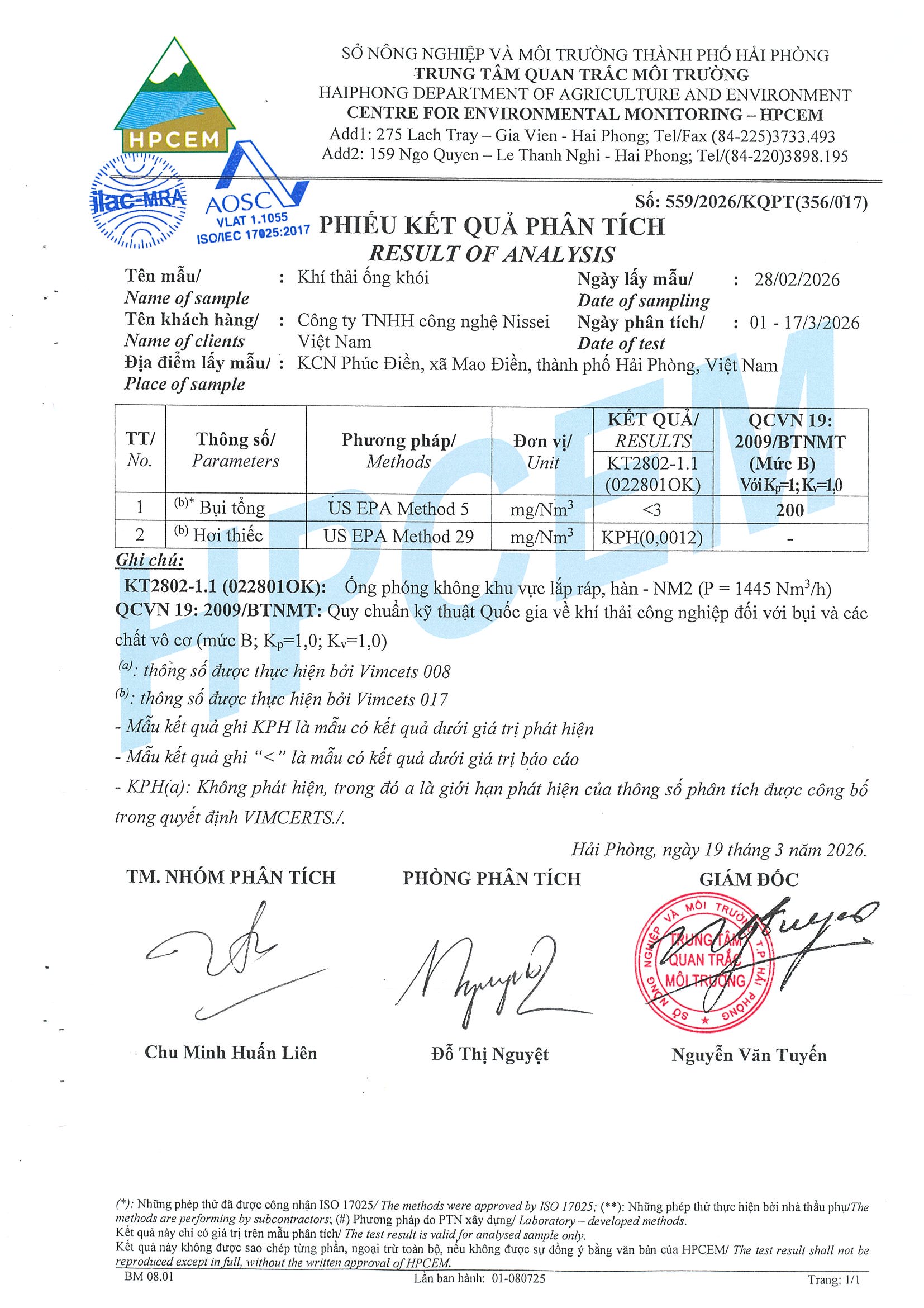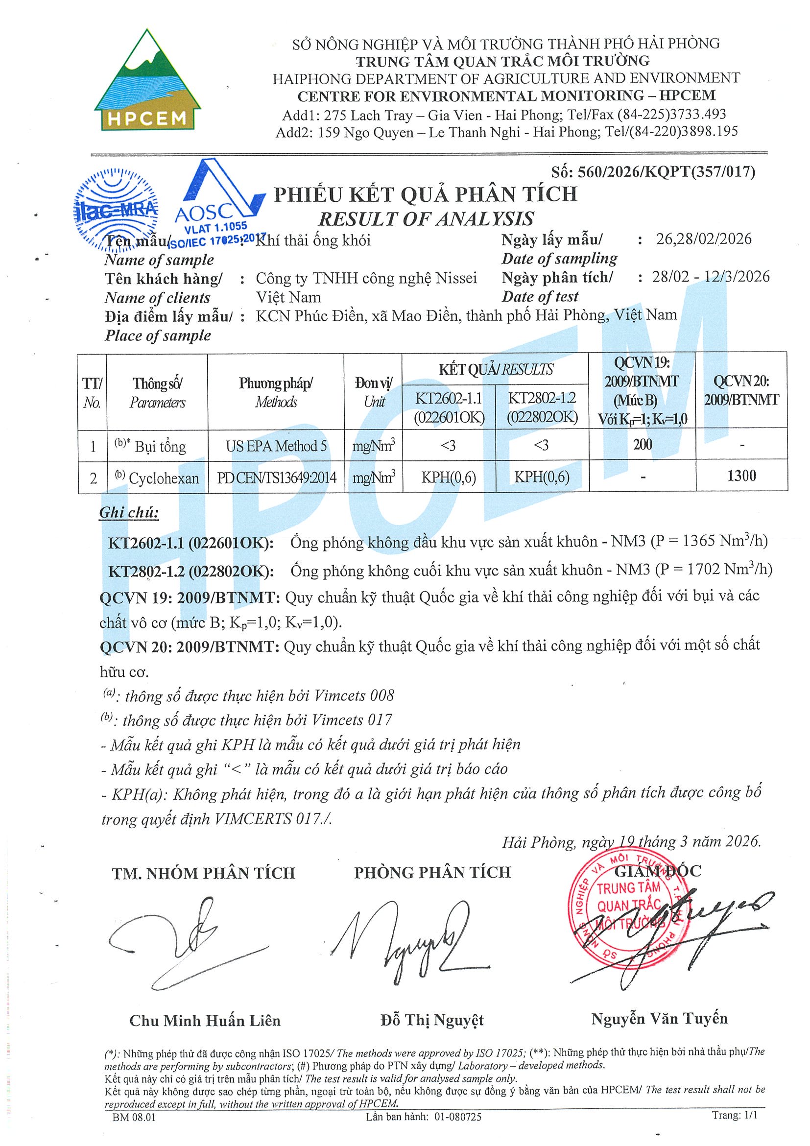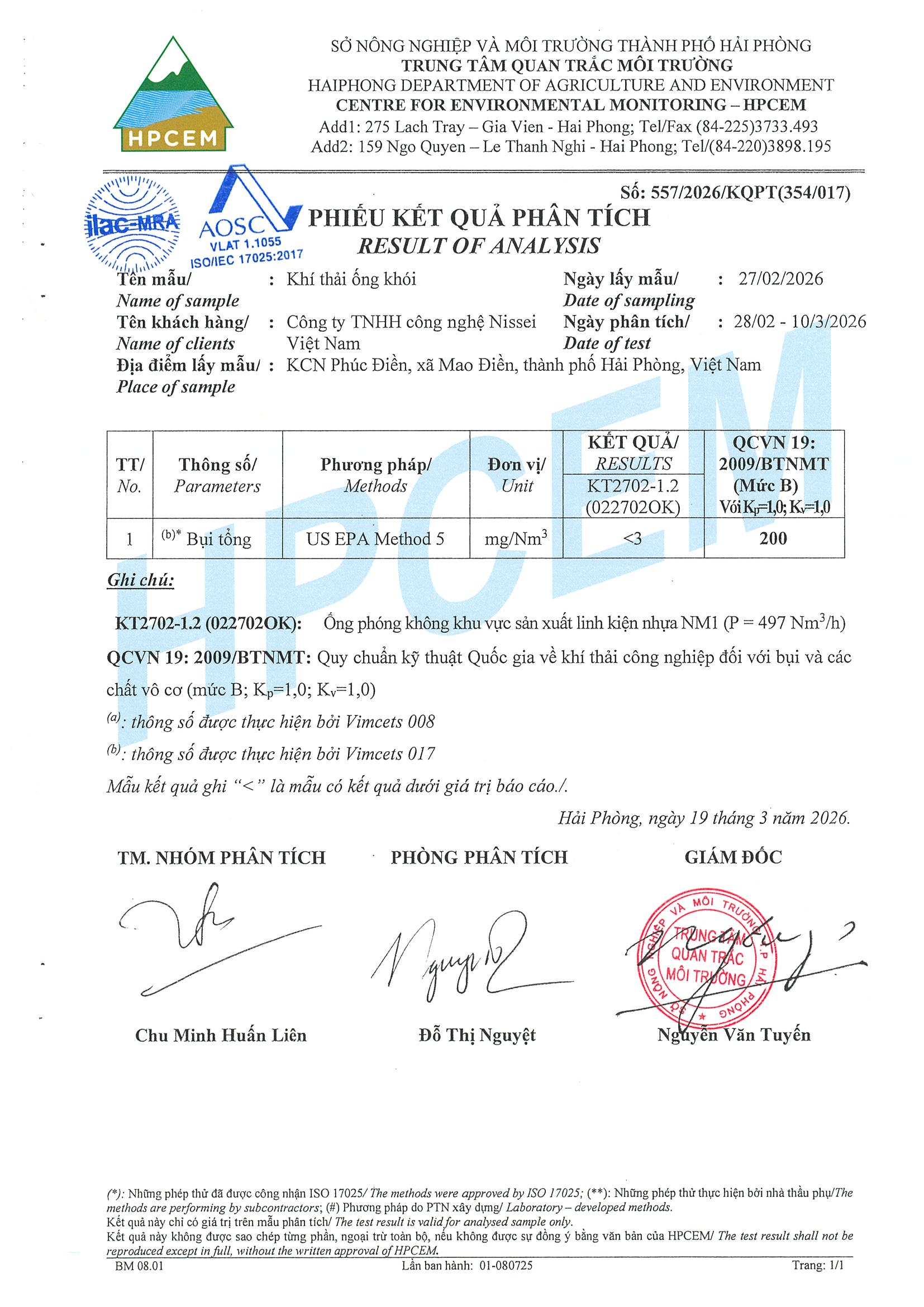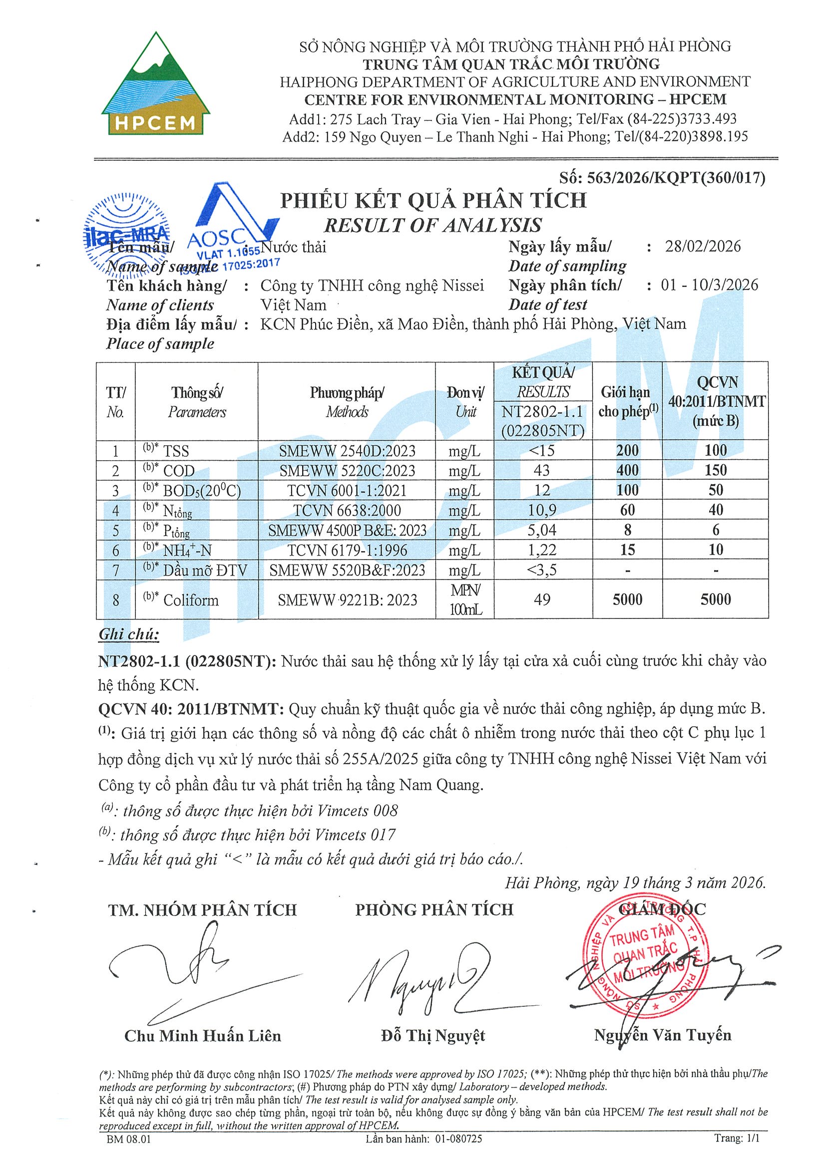 Kết quả quan trắc môi trường Công ty TNHH Công nghệ Nissei Việt Nam quý I, 2026