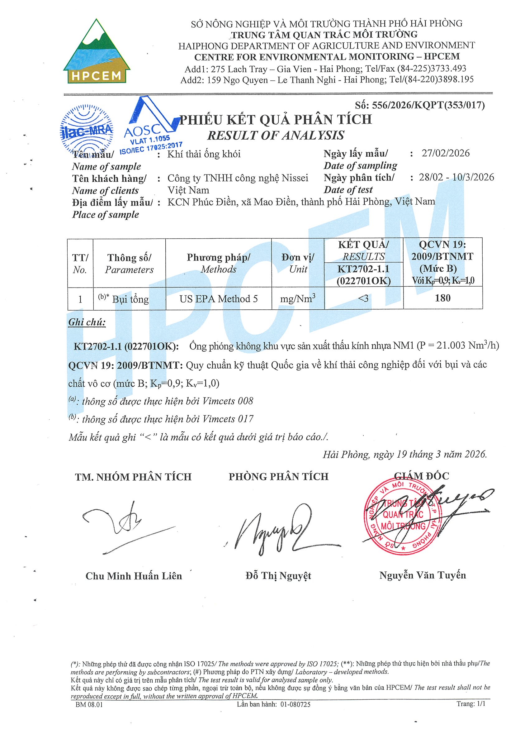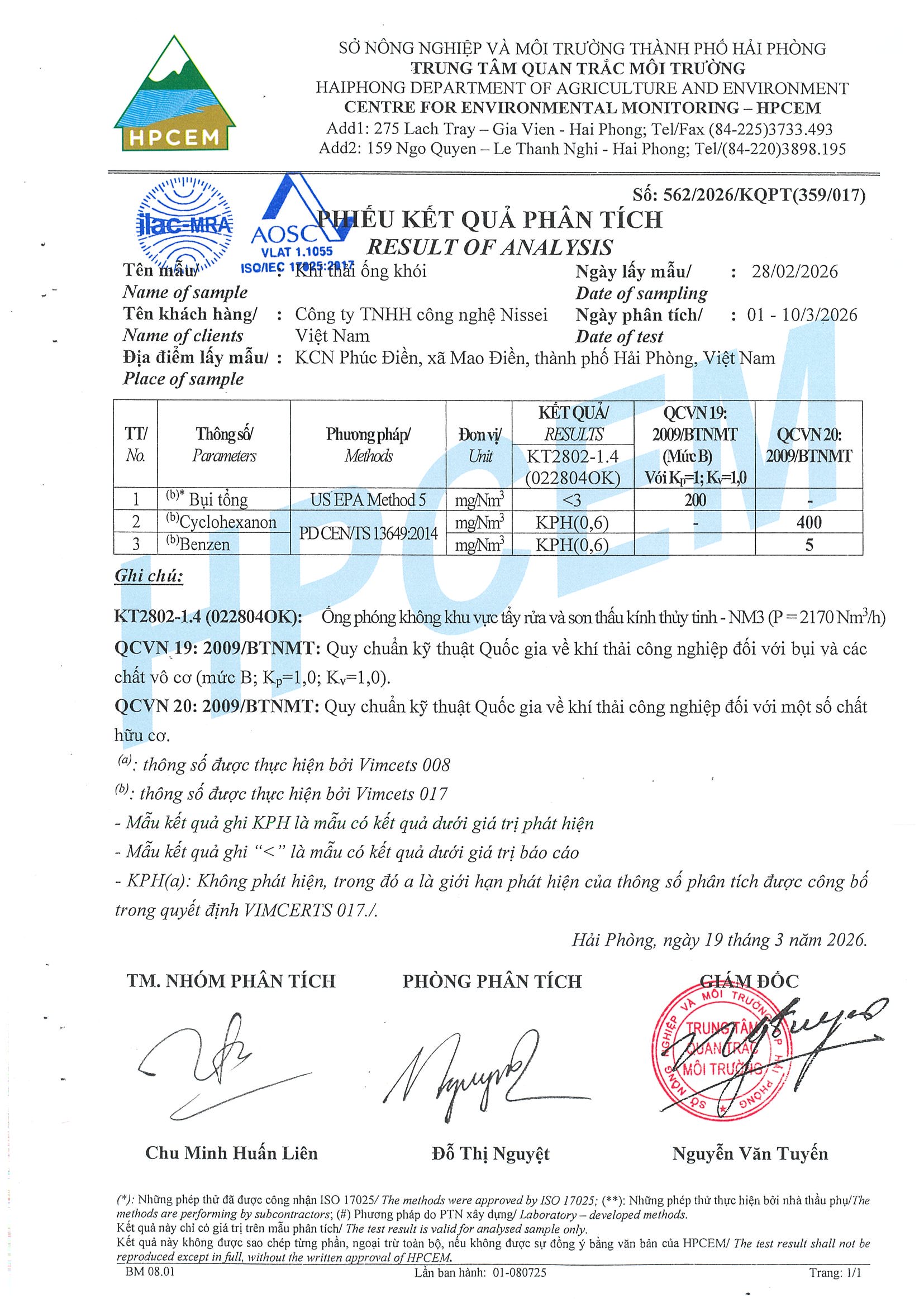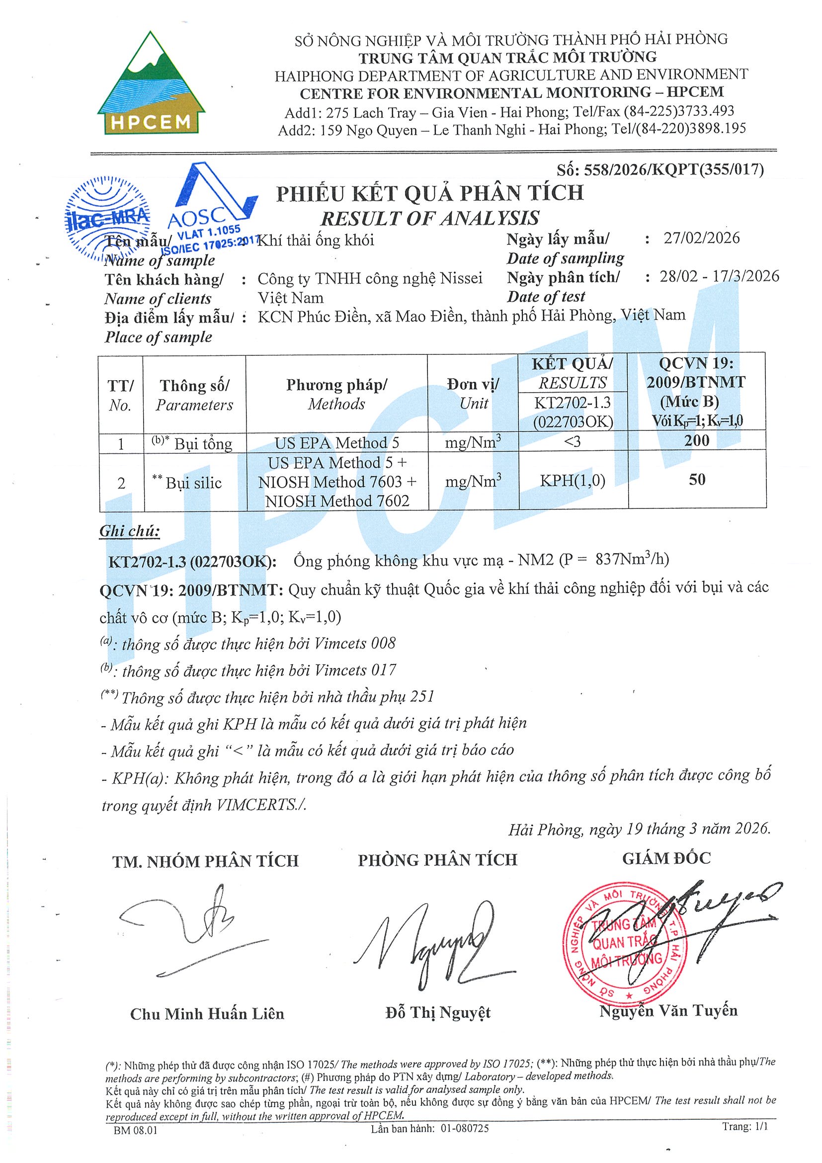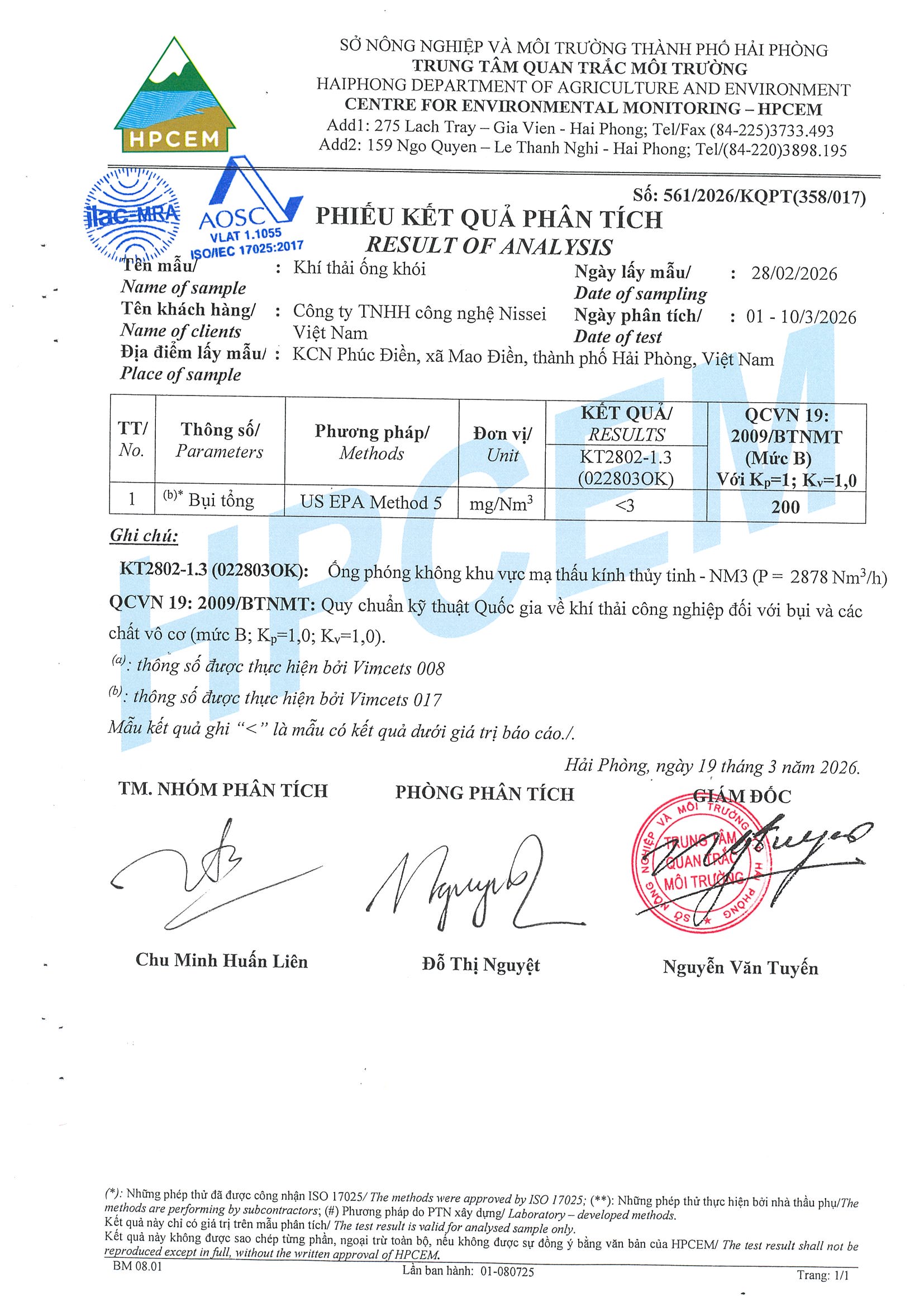 Kết quả quan trắc môi trường Công ty TNHH Công nghệ Nissei Việt Nam quý I, 2026