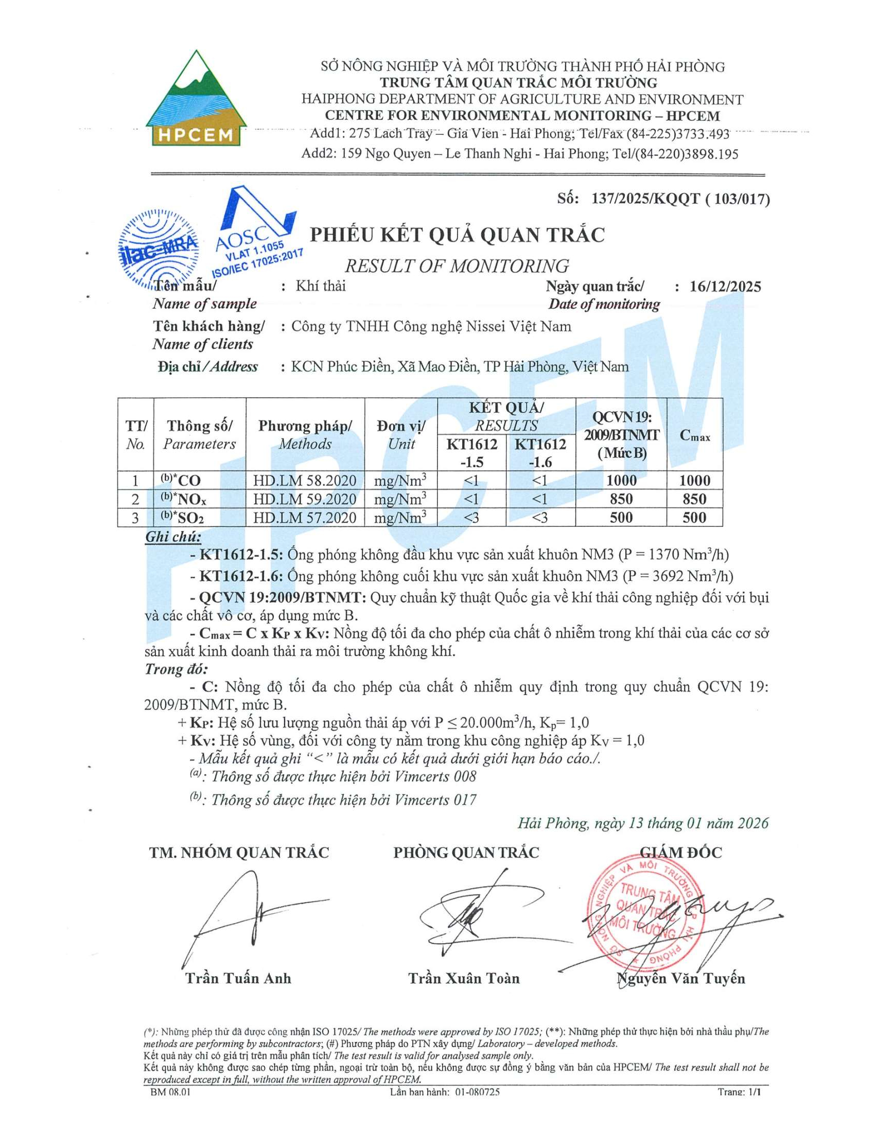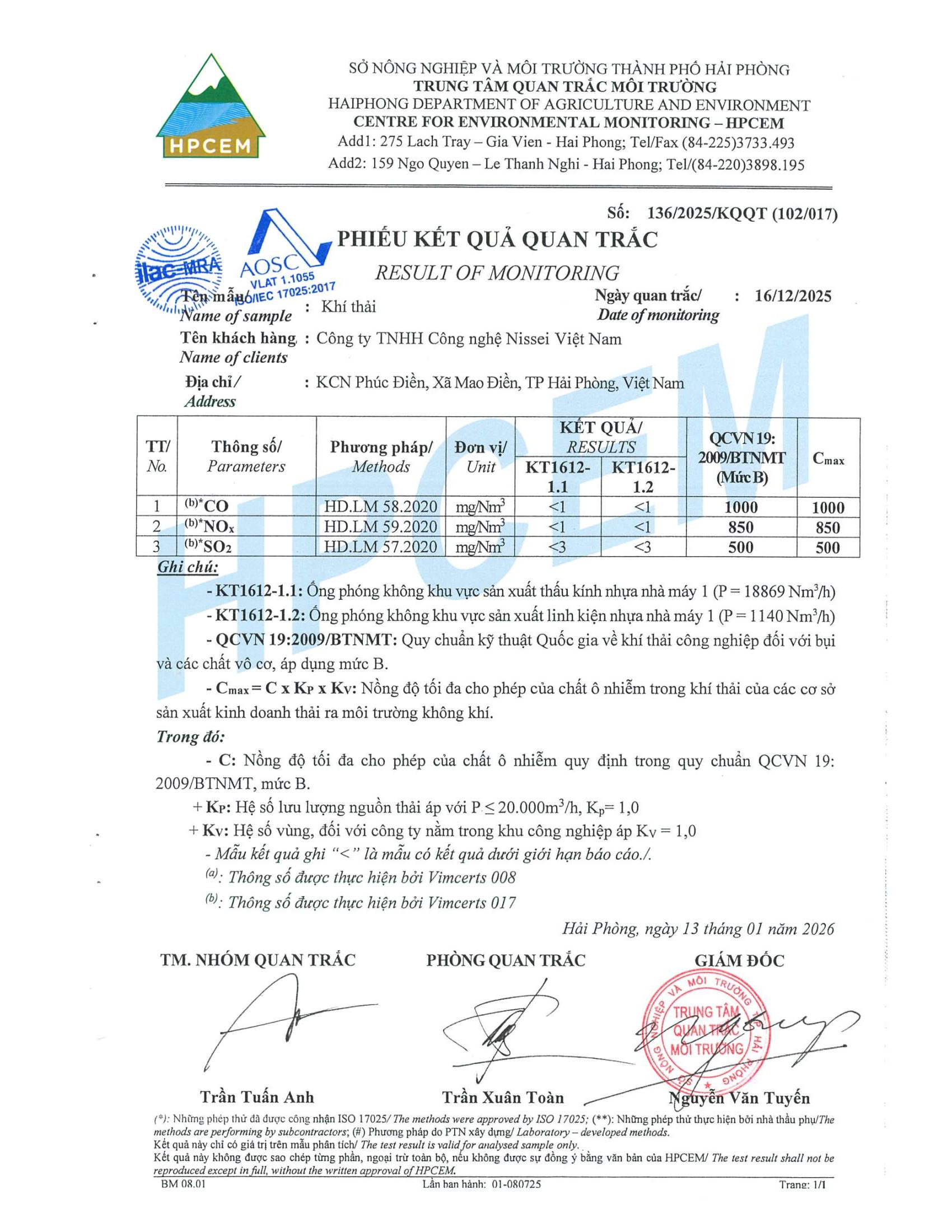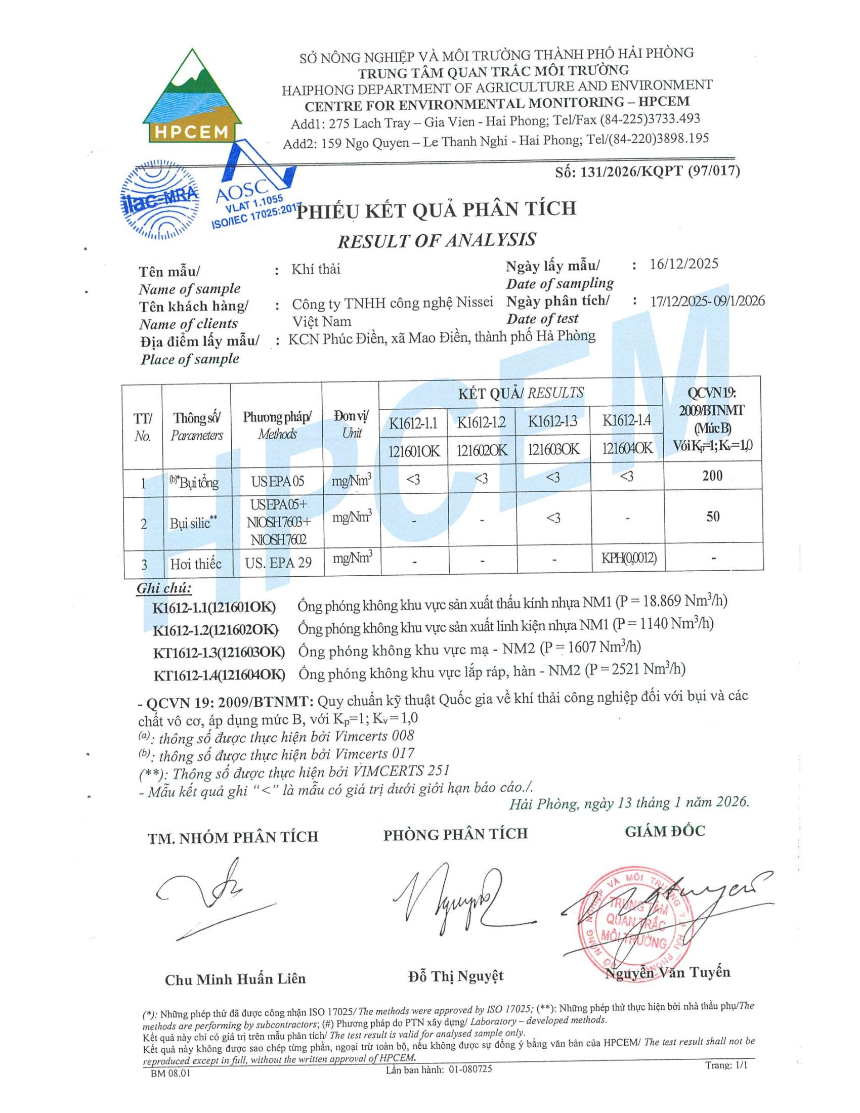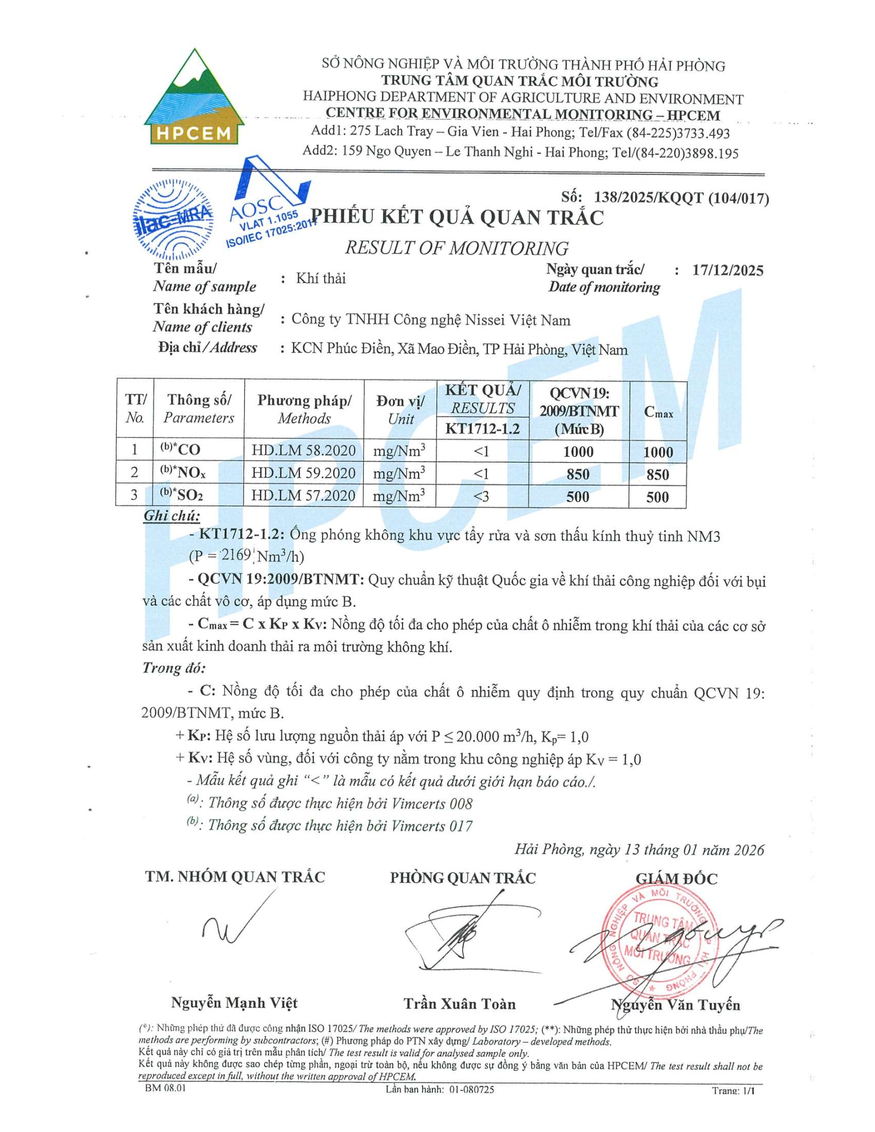 Kết quả quan trắc môi trường Công ty TNHH Công nghệ Nissei Việt Nam quý IV, 2025