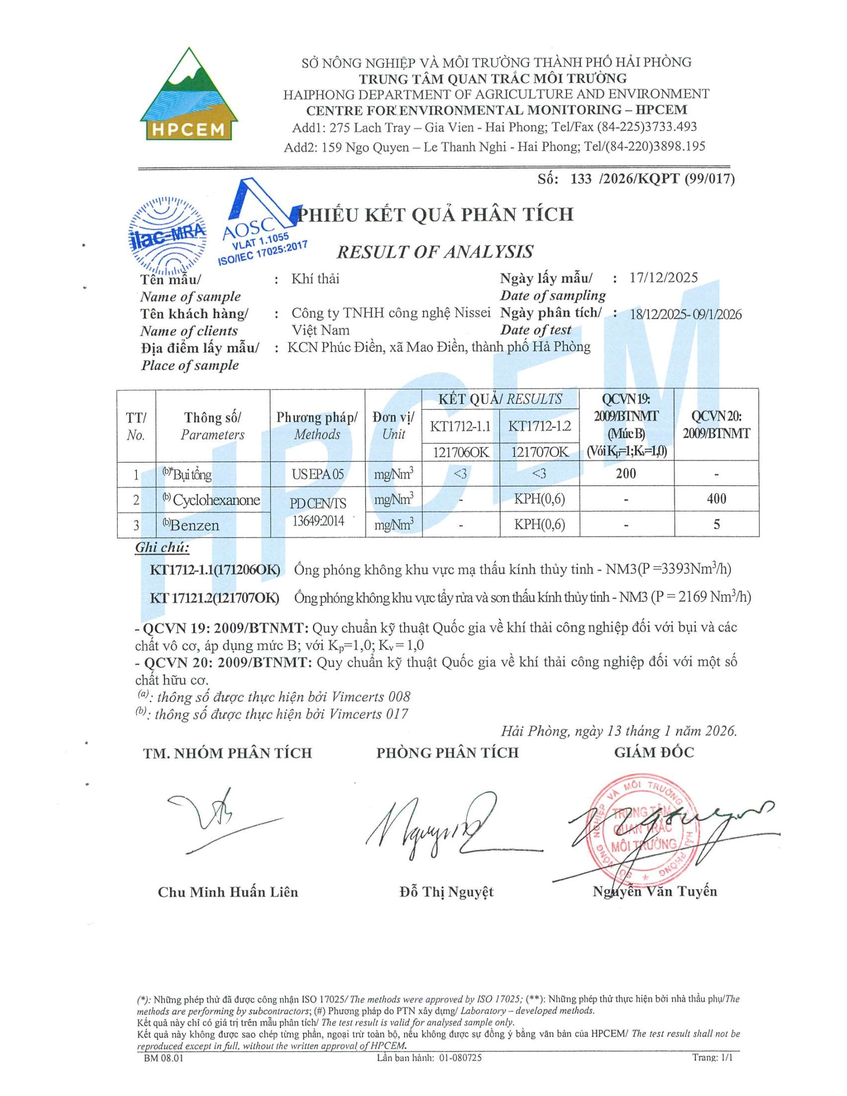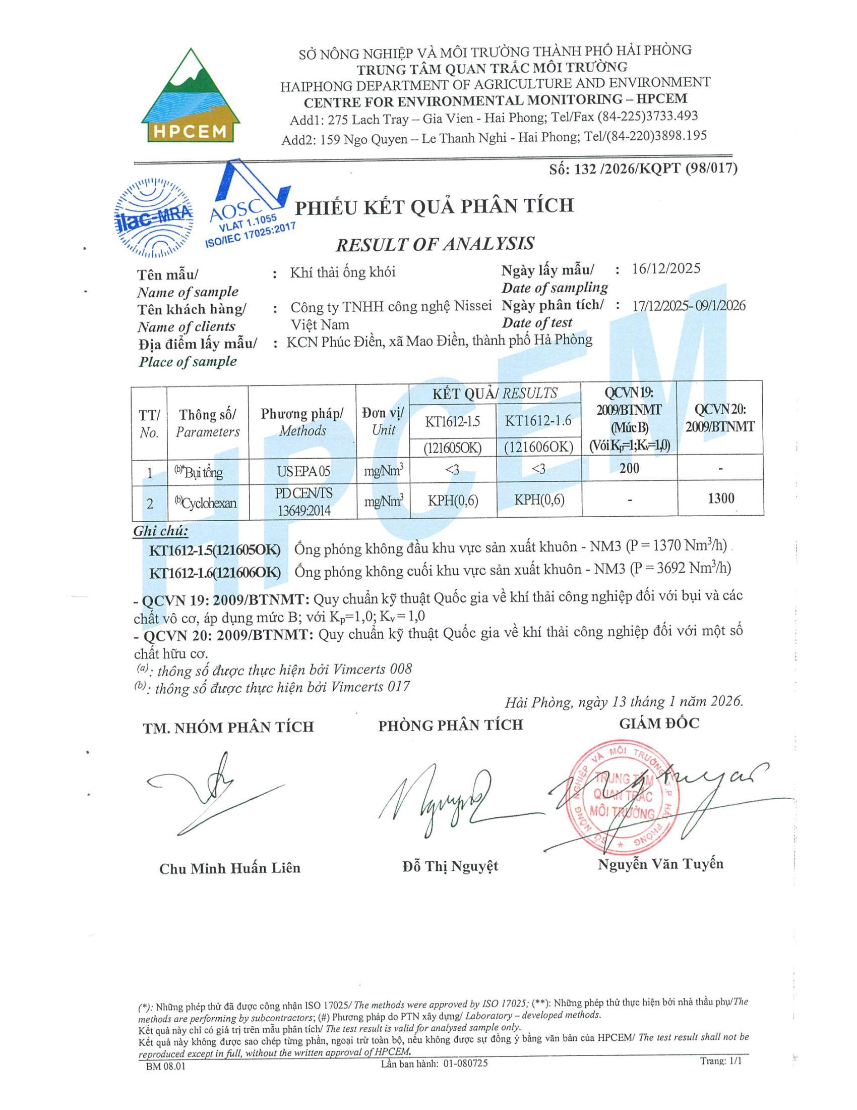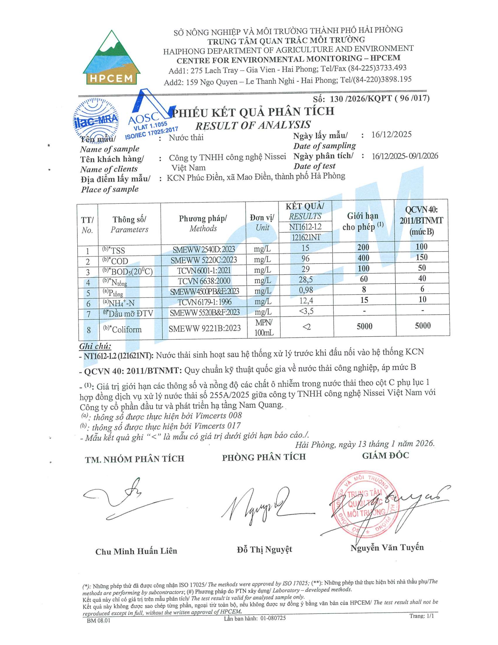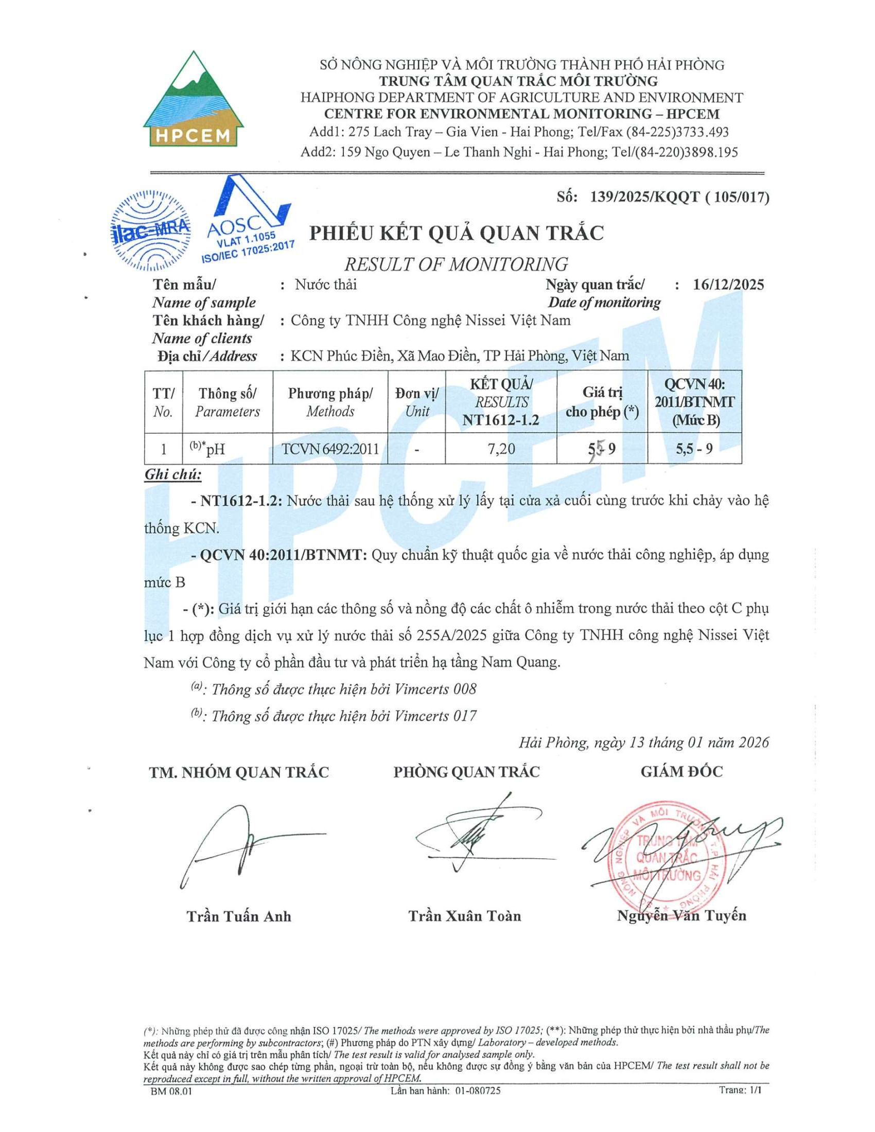 Kết quả quan trắc môi trường Công ty TNHH Công nghệ Nissei Việt Nam quý IV, 2025